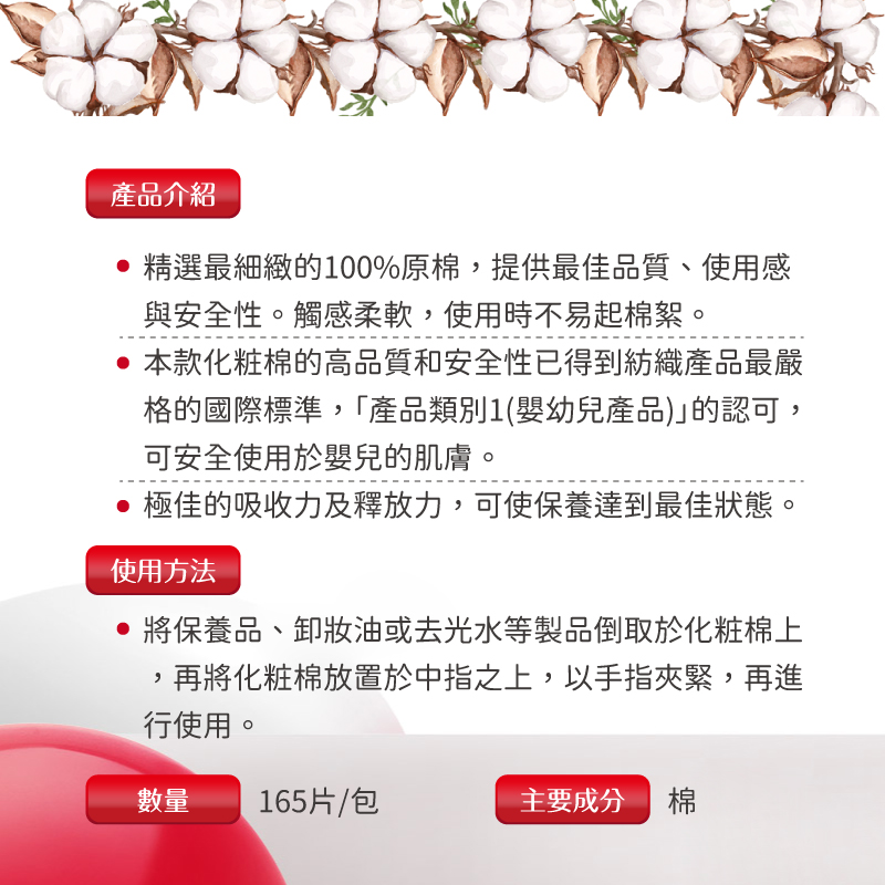 - 本款化粧棉的高品質和安全性已得到紡織產品最嚴格的國際標準,「產品類別1(嬰幼兒產品)」的認可,可安全使用於嬰兒的肌膚。