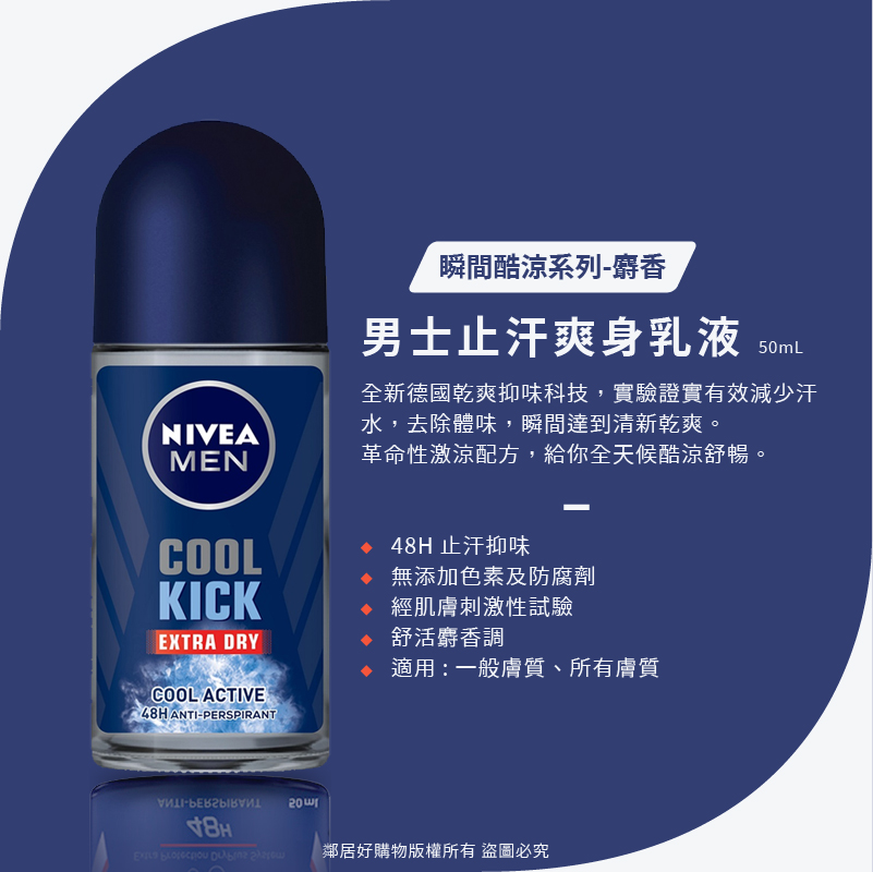 【Nivea妮維雅】男士瞬間酷涼系列止汗爽身乳液50ML-麝香