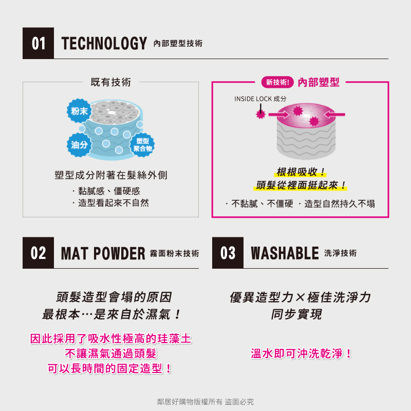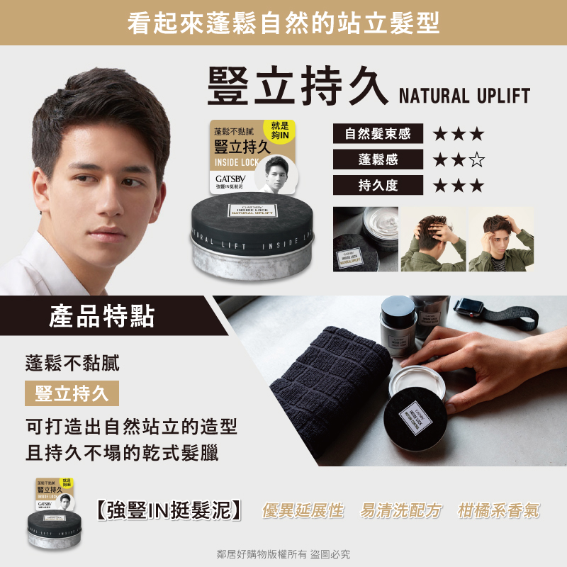 可打造出自然站立的造型,且持久不塌的乾式髮泥。