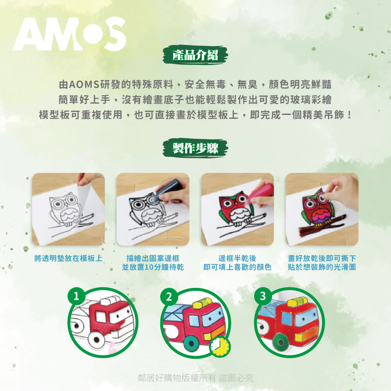 • 由AOMS研發的特殊原料,安全無毒、無臭,顏色明亮鮮豔