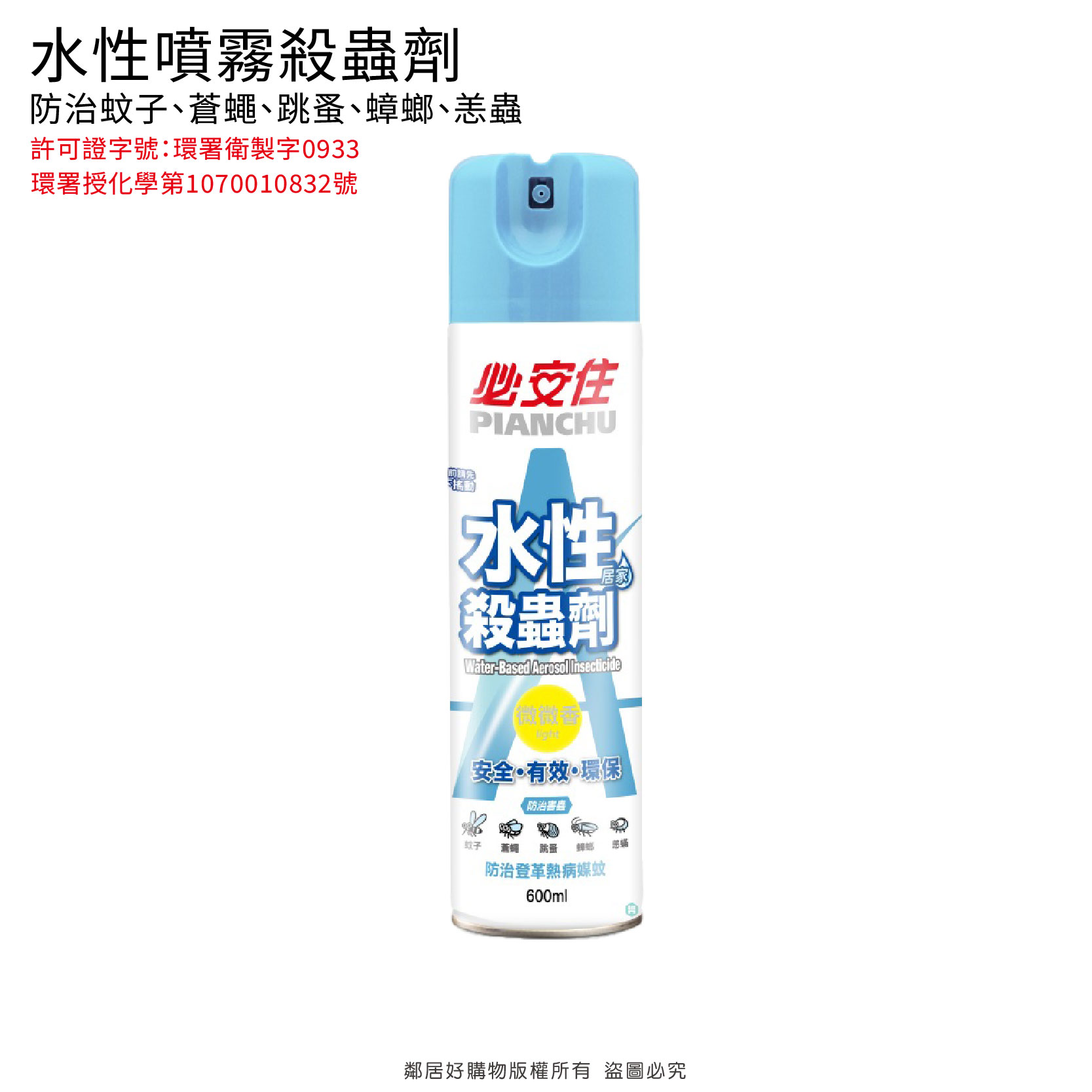 一般環境用藥 許可證字號 : 環署衛製字0933號 環藥販賣字第19-125號 性能:防治蚊子、蒼蠅、跳蚤、蟑螂、恙蟲 內容及劑型:600毫升(噴霧劑) 適用範圍:公私場所之室內外環境