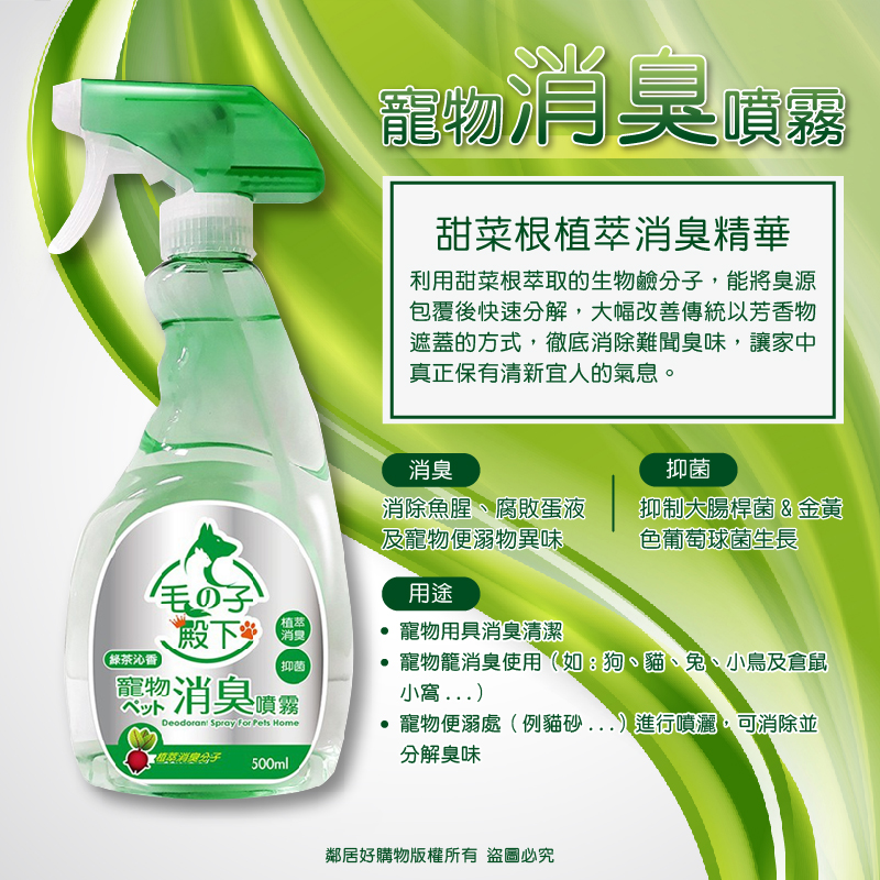 用途:寵物用具消臭清潔、寵物籠消臭使用(如:狗、貓、兔、小鳥及倉鼠小窩...)、寵物便溺處(例貓砂...)進行噴灑,可消除並分解臭味