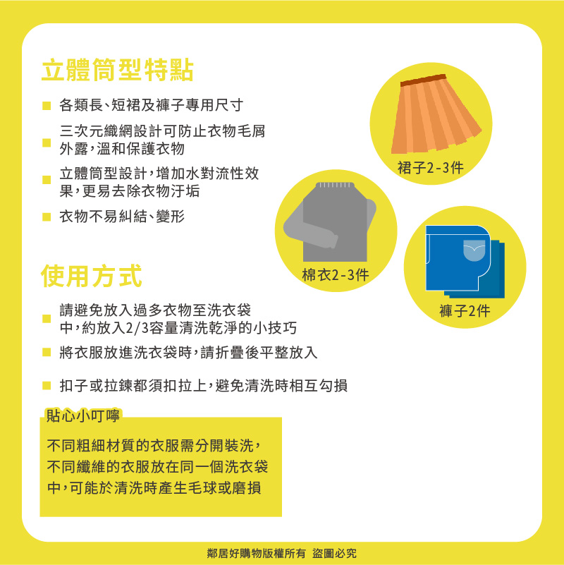 - 三次元織網設計可防止衣物毛屑外露,溫和保護衣物