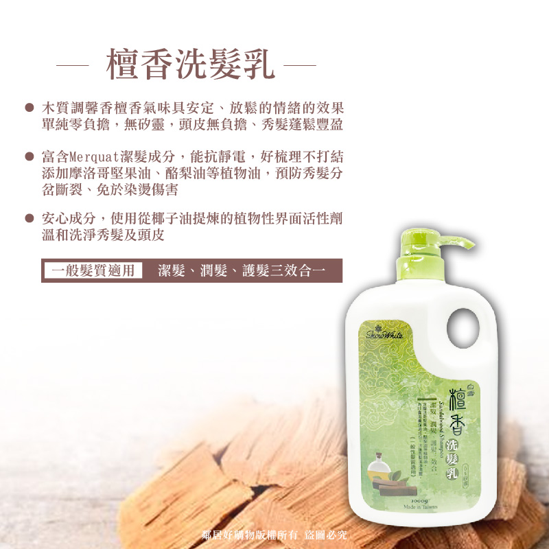 - 木質調馨香檀香氣味具安定、放鬆的情緒的效果,單純零負擔,無矽靈,頭皮無負擔、秀髮蓬鬆豐盈