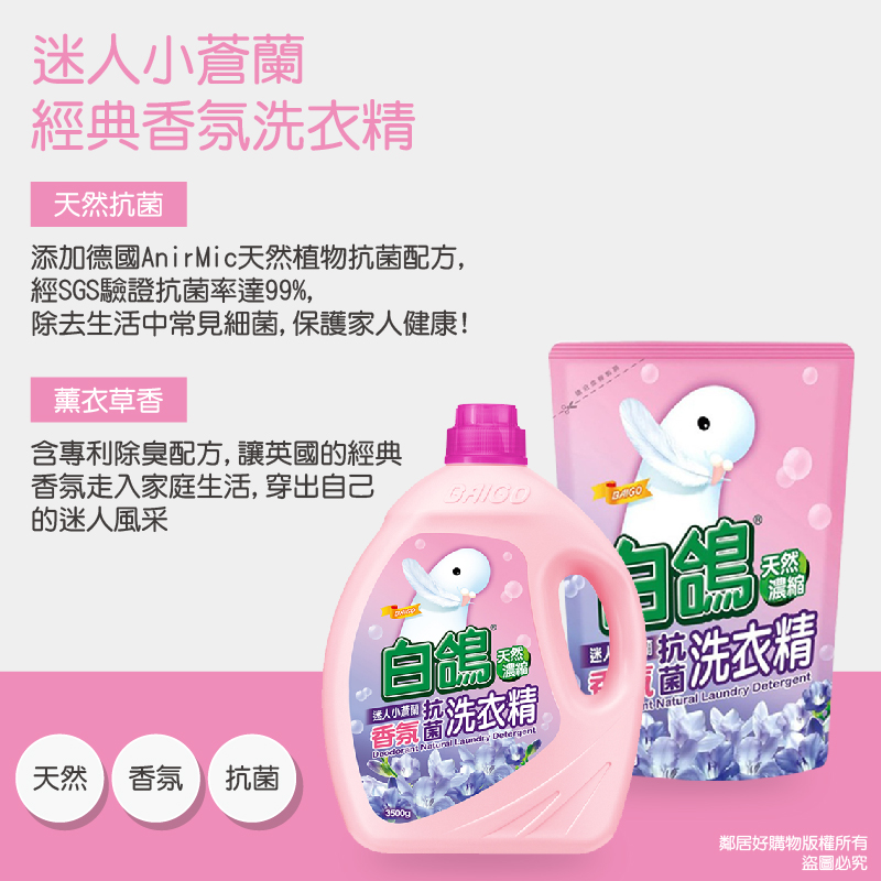 【白鴿】天然濃縮抗菌洗衣精-迷人小蒼蘭