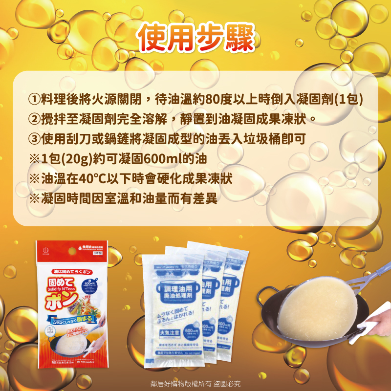 ①料理後將火源關閉,待油溫約80度以上時倒入凝固劑(1包)