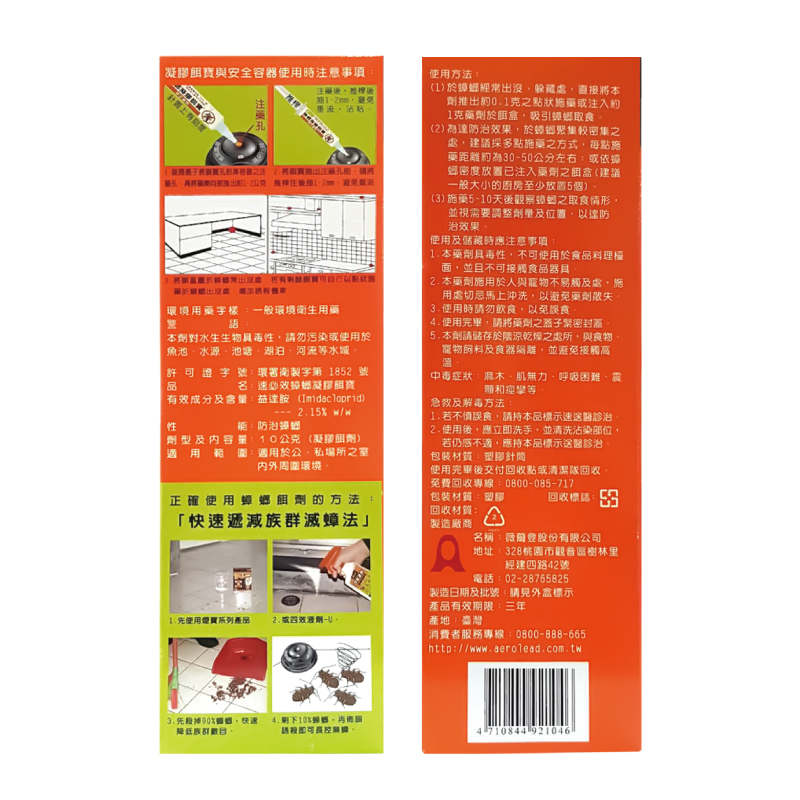 內容物:內附10克餌寶+5個容器盒送150ml四效殺蟲液劑