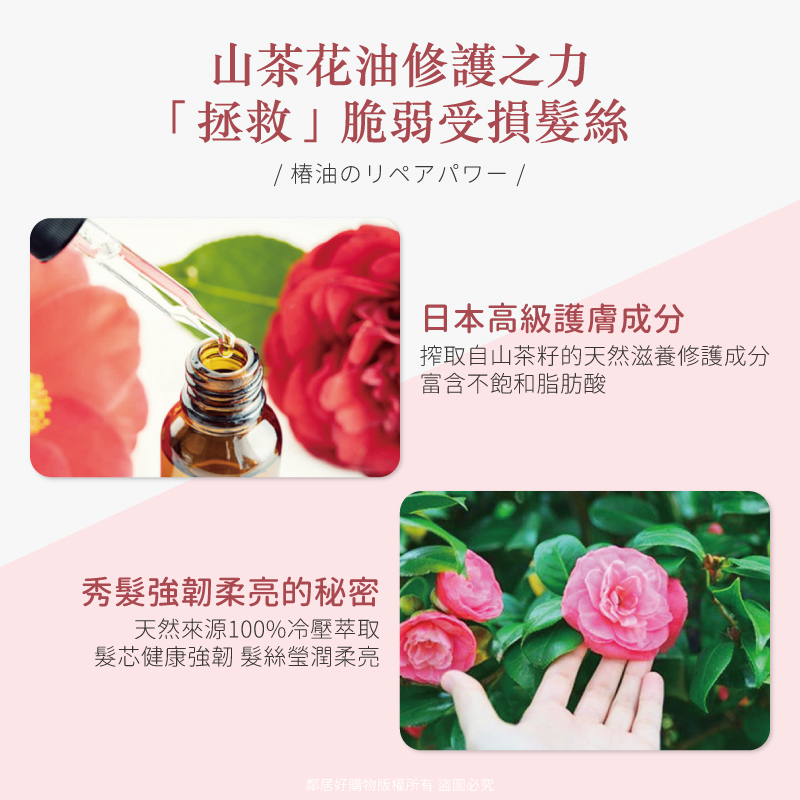 ◆ 山茶花油:100%冷壓萃取,保留天然保濕,修護毛髮成分