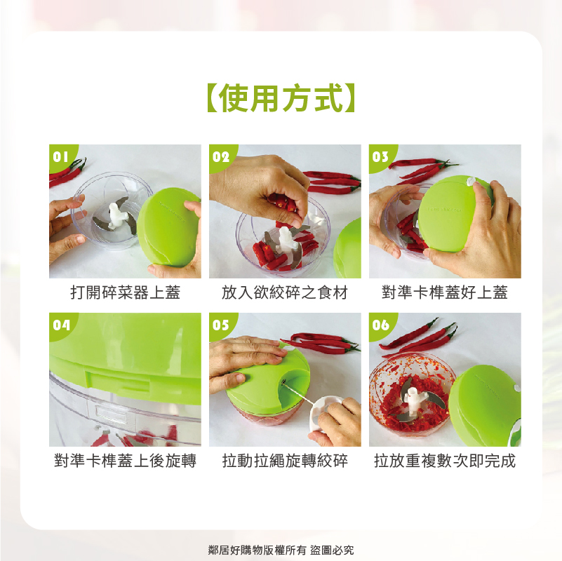 尼龍拉繩不易斷裂,使食材絞碎更均勻