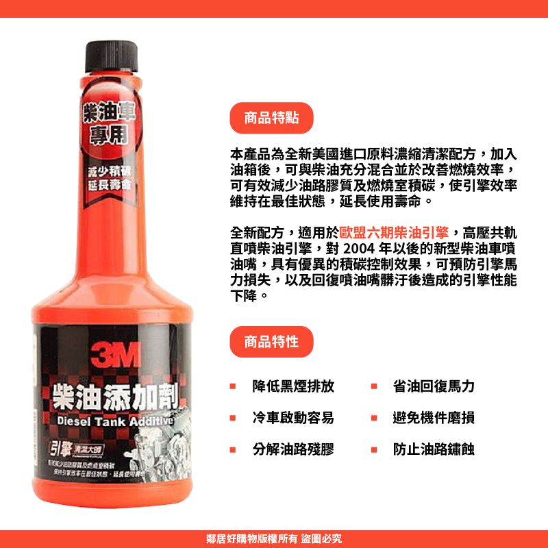 本產品為全新美國進口原料濃縮清潔配方,加入油箱後,可與柴油充分混合並於改善燃燒效率,可有效減少油路膠質及燃燒室積碳,使引擎效率維持在最佳狀態,延長使用壽命。全新配方,適用於歐盟六期柴油引擎,高壓共軌直噴柴油引擎,對2004年以後的新型柴油車噴油嘴,具有優異的積碳控制效果,可預防引擎馬力損失,以及回復噴油嘴髒汙後造成的引擎性能下降。