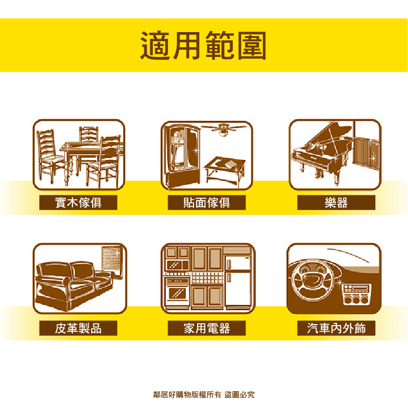 實木、木質貼面家具、皮革製品、聚酯漆面、大理石、磁磚、樂器及家用電器、汽車表板等
