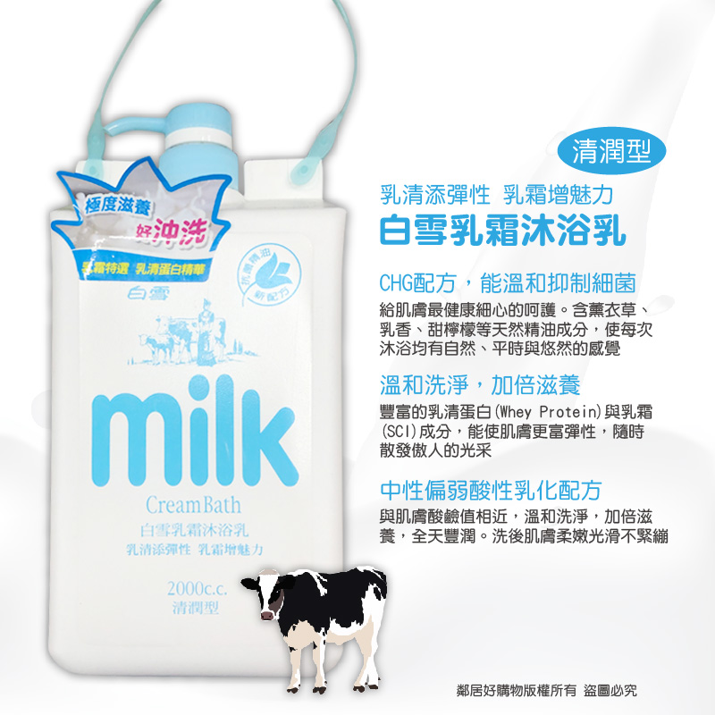 ● 豐富的乳清蛋白(Whey Protein)與乳霜(SCI)成分,能使肌膚更富彈性,隨時散發傲人的光采,中性偏弱酸性乳化配方,與肌膚酸鹼值相近溫和洗淨,加倍滋養,全天豐潤。洗後肌膚柔嫩光滑不緊繃