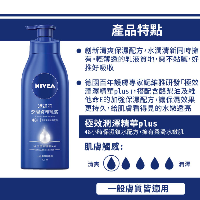 - 德國百年護膚專家妮維雅研發「極效潤澤精華plus」,搭配含酪梨油及維他命E的加強保濕配方,讓保濕效果更持久,給肌膚看得見的水嫩透亮。