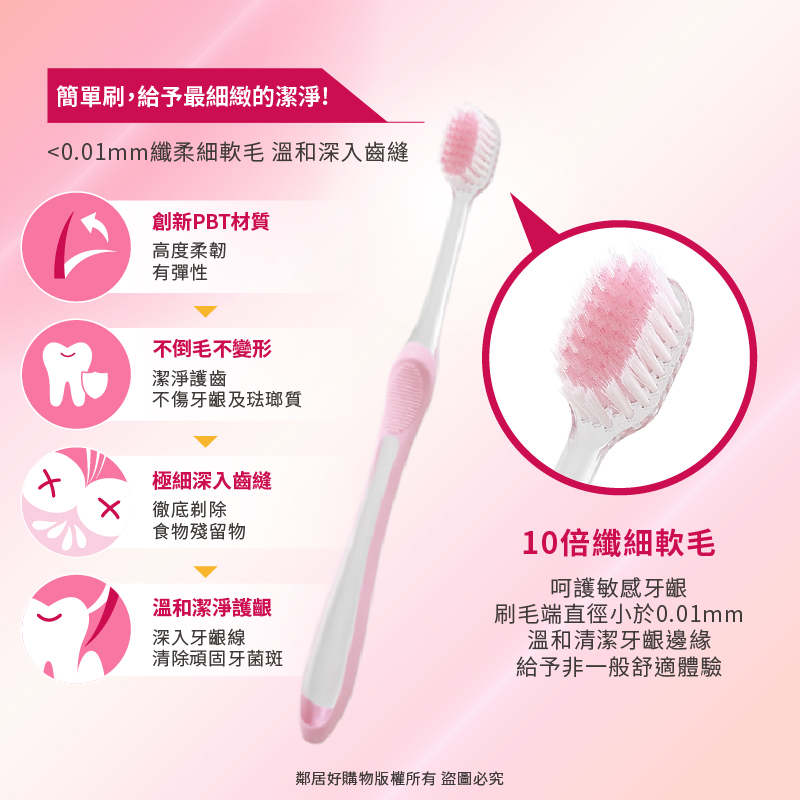 - 10倍纖細軟刷毛-加寬2倍刷頭,高密度植入<0.01mm纖柔細軟毛,可均勻分散牙齦受壓力,密集且更快速清除牙菌斑,有效率清潔容易忽略部位。