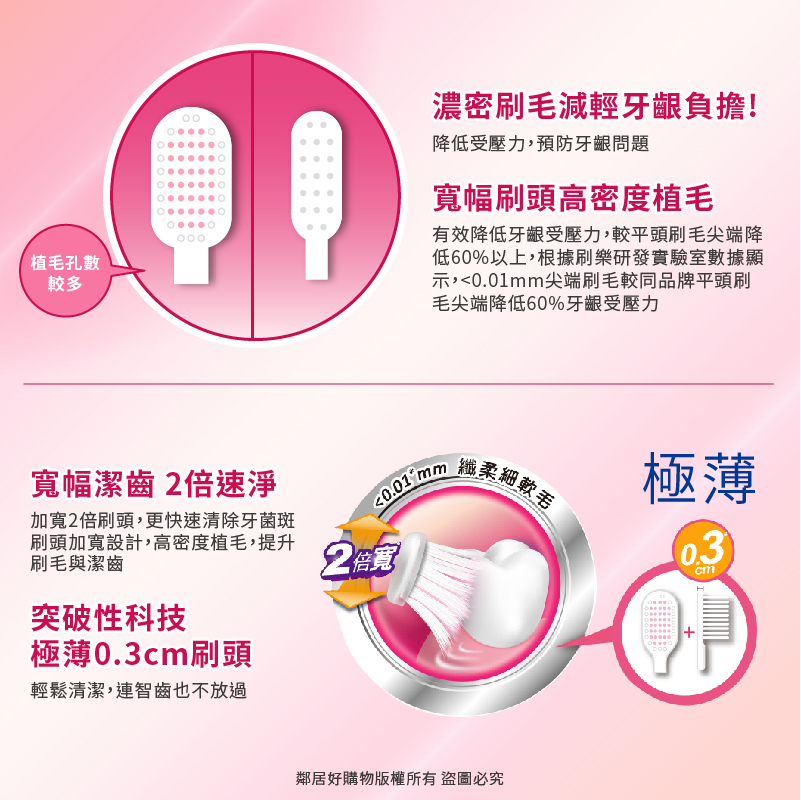 - 極薄刷頭-極薄0.3刷頭,能更深入智齒區難刷部位